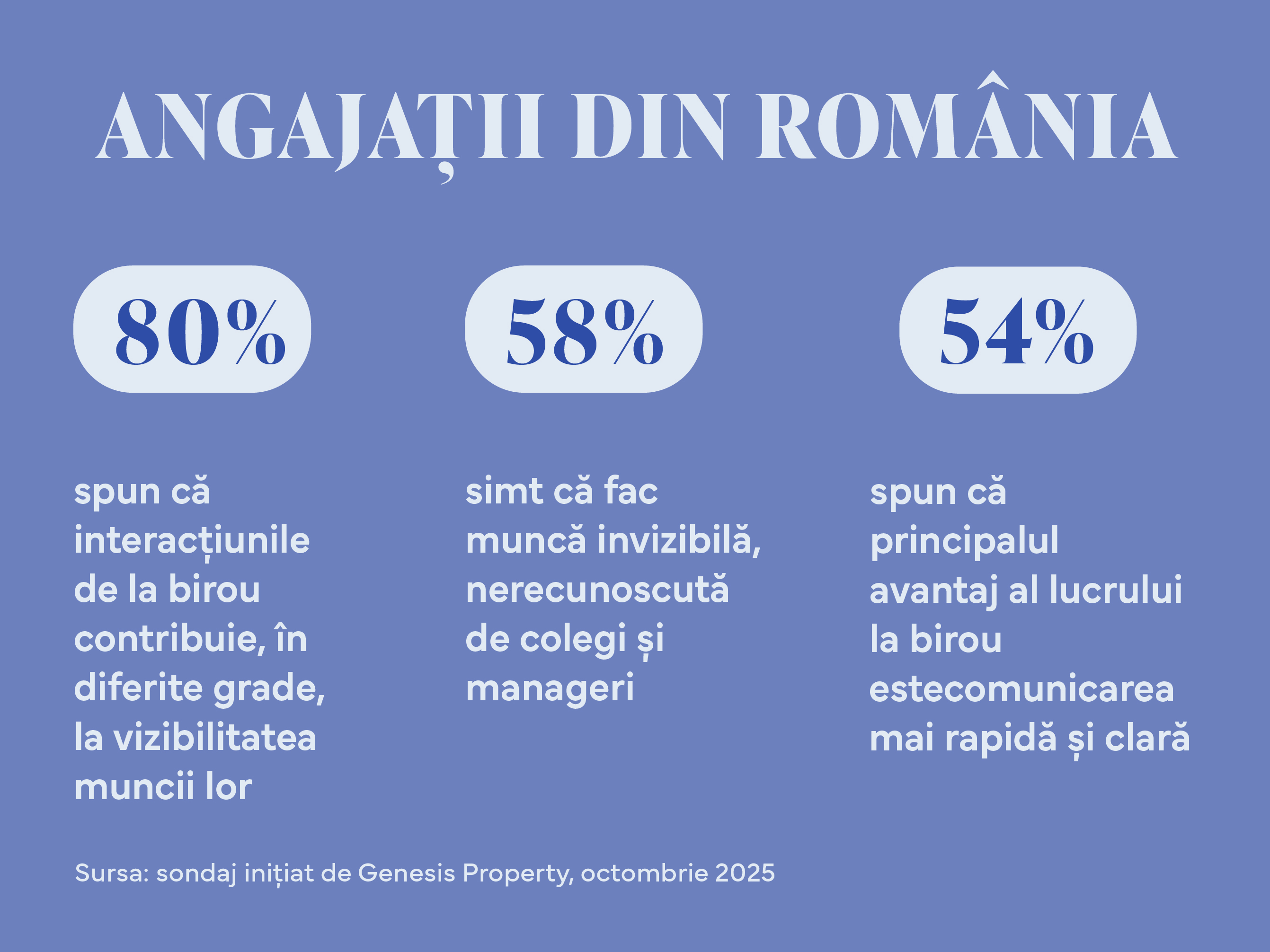 Într-o piață a muncii supusă unor presiuni și tensiuni tot mai mari, din ce în ce mai mulți angajați au sentimentul că munca lor trece neobservată, o situație care poate alimenta demotivarea și distanțarea față de colegi și manageri. Peste 58% dintre angajați simt că fac muncă invizibilă, nerecunoscută de colegi și manageri, însă aproape 80% spun că interacțiunile de la birou contribuie, în diferite grade, la vizibilitatea muncii lor și îi ajută să fie mai apreciați de colegi și manageri, arată un sondaj realizat de Genesis Property în octombrie 2025 pe un eșantion de 1.025 respondenți la nivel național.