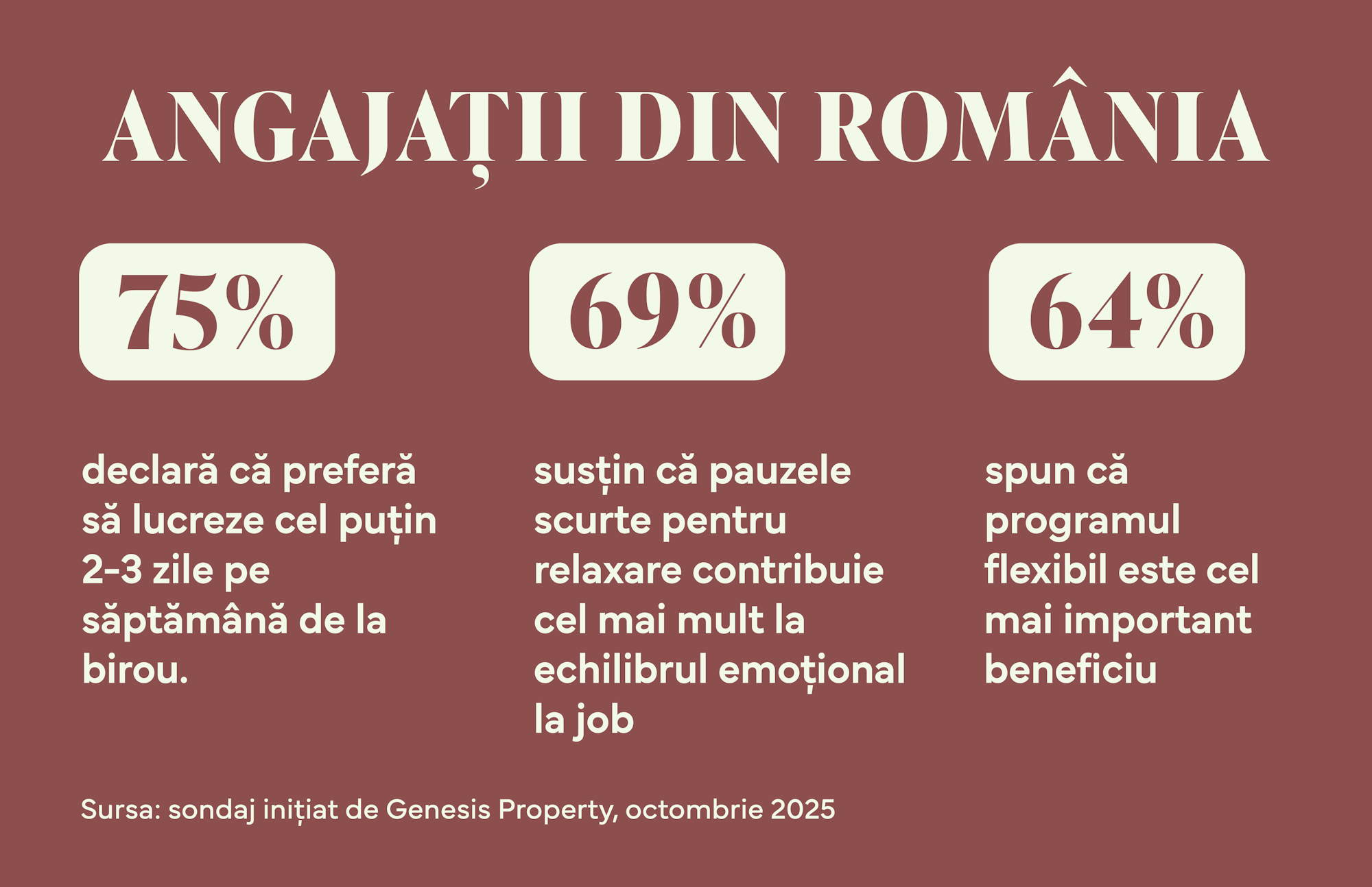 Angajații resimt tot mai puternic nesiguranța legată de viitorul profesional și financiar, pe fondul incertitudinilor economice care afectează companiile. Peste 47% dintre angajați spun că sunt îngrijorați privind stabilitatea veniturilor, 45,5% se tem de eventuale măsuri ale companiei unde lucrează ca răspuns la contextul economic, iar 40,2% simt că nu-și mai pot menține un echilibru sănătos între job și viața personală, arată un sondaj realizat de Genesis Property în octombrie 2025 pe un eșantion de 1.025 respondenți la nivel național. Lucrul la birou, interacțiunea cu managerii și colegii și pauzele în timpul programului sunt însă pentru mulți angajați o sursă de stabilitate care contribuie la reducerea stresului, la creșterea motivației și la separarea mai bună între job și timpul liber.