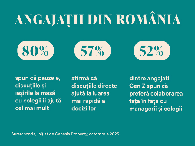 „Biroul redevine un spațiu cu valoare reală pentru angajați, un loc în care munca devine mai plăcută datorită interacțiunilor firești și ritmului pe care îl oferă. Pauzele, discuțiile personale și apropierea de colegi și manageri consolidează coeziunea și aprind creativitatea. Într-o lume extrem de dinamică și pe o piață a muncii agitată și tensionată, biroul nu mai este doar un loc de lucru, ci un mediu care hrănește starea de bine, autenticitatea și bucuria de a lucra alături de ceilalți”, spune Elena Panait, Head of Leasing & ComYunitY la Genesis Property.